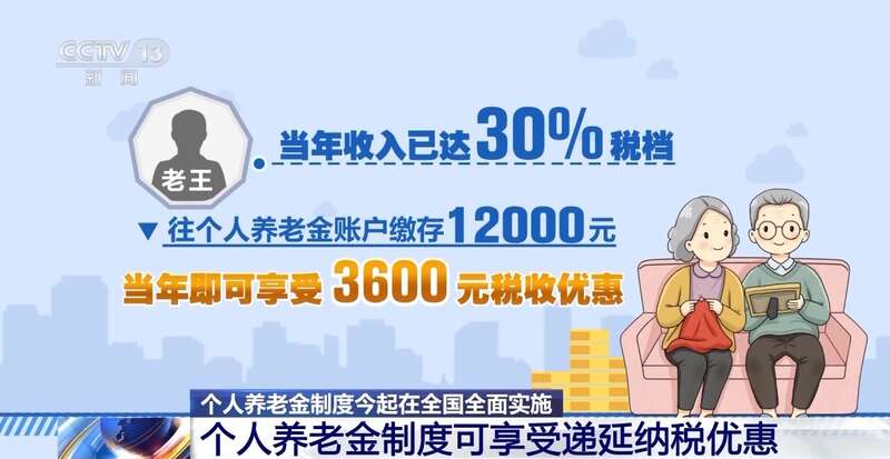 举个例子,比如老王当年收入已达30%税档,往个人养老金账户缴存12000元,当年即可享受3600元税收优惠。退休后可以领取这1.2万元和对应的投资收益,这1.2万元到时候需要按3%缴纳360元个税。