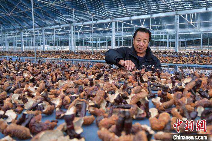 12月10日,西藏林芝米林市米林镇红太阳科技示范家庭农场负责人尼玛查看灵芝风干情况。中新社记者 江飞波 摄