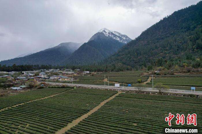 12月13日,西藏林芝波密县易贡茶场雪山、茶田风光。(无人机画面)中新社记者 江飞波 摄