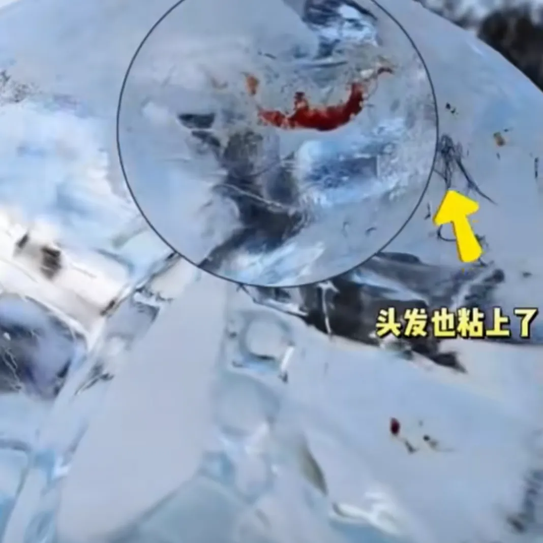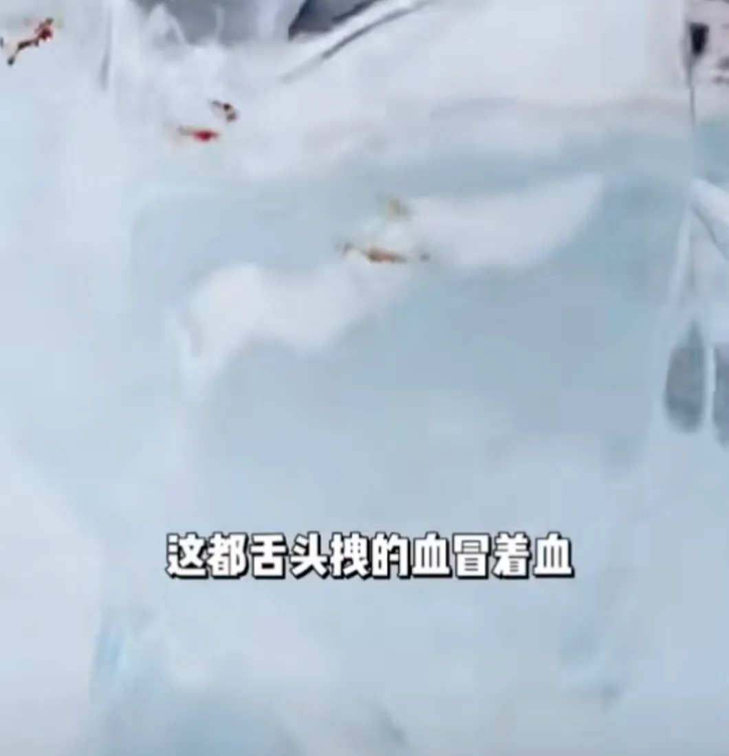 视频中,在透明的冰雕上留有多处鲜血印,也有头发被粘在冰上。画外音称:“全是血,全是嘴唇印,这都舌头冒的血。”