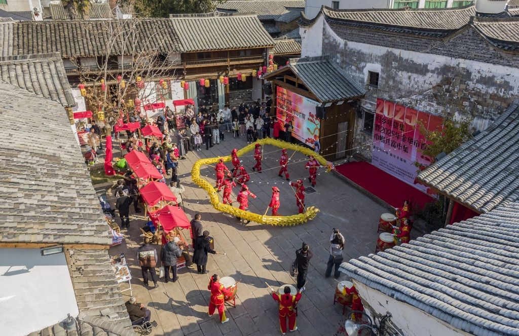 2024年12月28日,浙江省金华市金东区岭下镇坡阳古街,游客观看舞龙表演。