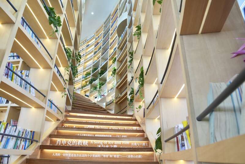 绿点美学馆就建立在四面环山、风光旖旎的蟠龙顶,集咖啡、简餐、图书于一身,室内创意设计了“旋转书梯”,打造阶梯阅读区,一经开放便成为网红打卡点,室外还有一片草地,可供微酌清唱,悠然自得。