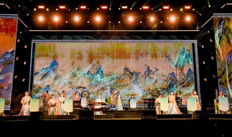 音乐诗画《江山竞秀》以北宋名画《千里江山图》为创意原点,通过12幅壮丽图景的精心编排,展现祖国的青山绿水和人文风情。整场演出融合箜篌、琵琶、竹笛、古琴等民族乐器和西洋铜管乐,为观众带来中西交融的音乐体验。