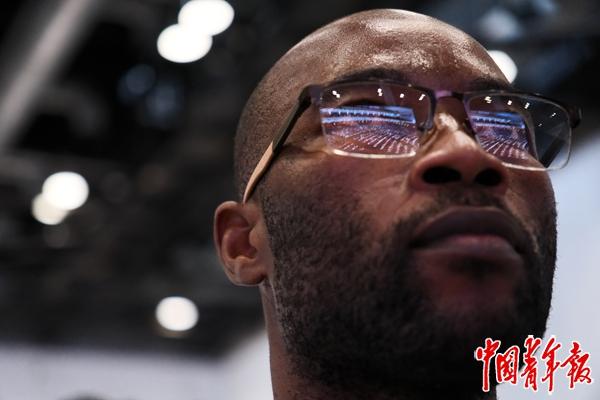 2024年9月5日,2024年中非合作论坛峰会新闻中心,莫桑比克随团记者阿纳克莱托·梅赛德斯(音译)正在观看大屏幕里的峰会开幕式画面。当日,2024年中非合作论坛峰会在北京开幕,中外记者高度关注。中青报·中青网记者 田嘉硕/摄