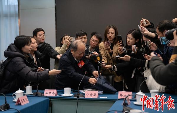 2024年3月5日下午,北京铁道大厦,全国政协十四届二次会议经济界别小组会议后,中外媒体记者将全国政协常委、经济委员会副主任宁吉喆团团围住,争取采访的机会。全国两会是观察中国经济的重要窗口,两会上的经济人物一向备受瞩目,代表、委员中的经济领域专家学者,国企、民企负责人和新兴行业创业青年纷纷为中国经济的明天建言献策。中青报·中青网记者 李峥苨/摄