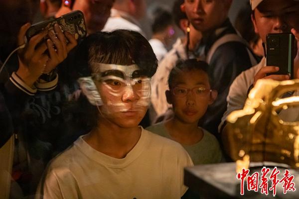 2024年3月29日,四川广汉三星堆博物馆,香港创知中学高二学生麦钲玮在展柜前端详一副黄金面具。近日,来自香港创知中学、香港福建中学,澳门培正中学、澳门培道中学4所学校的65名港澳师生来到四川,参加“美美与共 同心筑梦”港澳青少年四川专题研学活动,感受祖国内地的发展,厚植家国情怀。汪龙华/摄