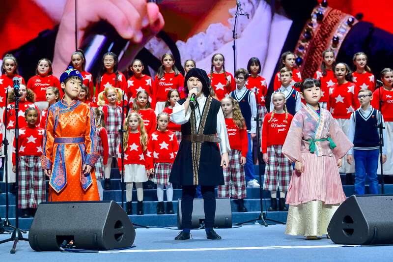 当音乐响起时,3个孩子缓缓来到舞台中央,其中两个是穿着中华民族服饰的中国孩子,另一个是与马可·波罗同名同姓的意大利少年。