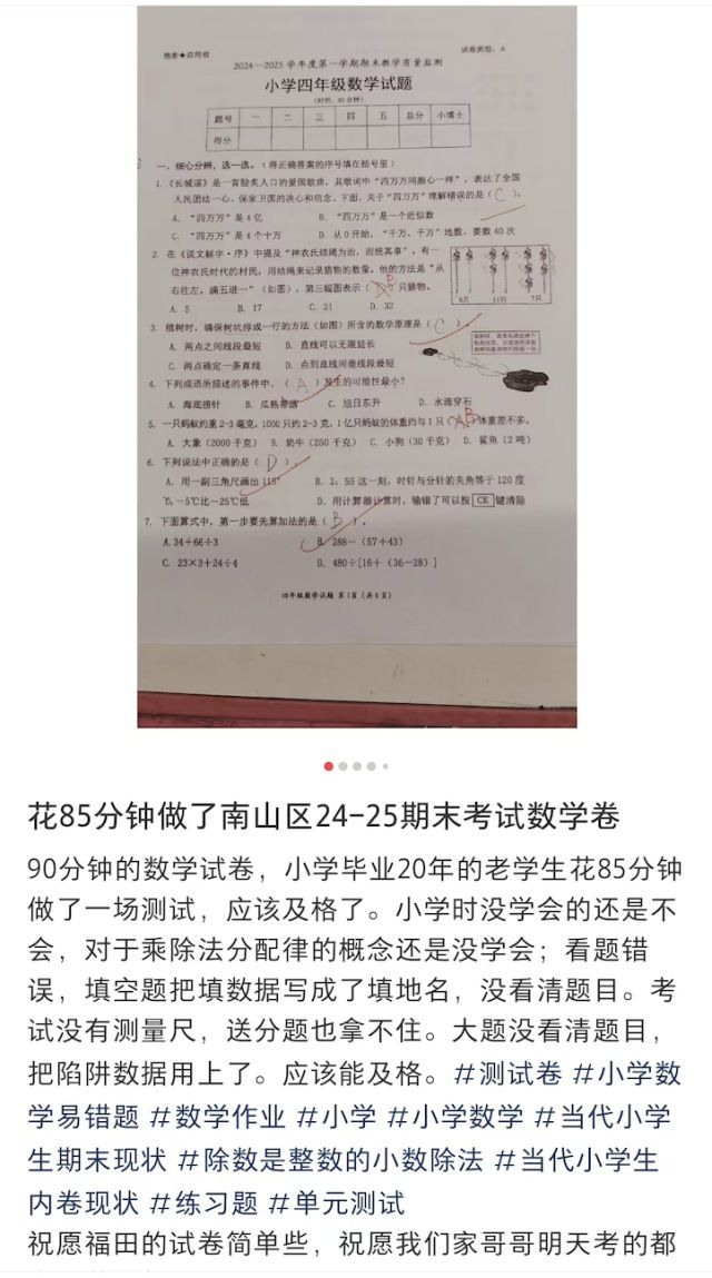 深圳南山区小学数学期末考试后