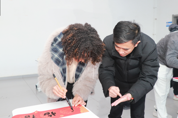 摩洛哥留学生邓洁学习写春联 供图:西安工业大学中国书法学院、国际教育学院