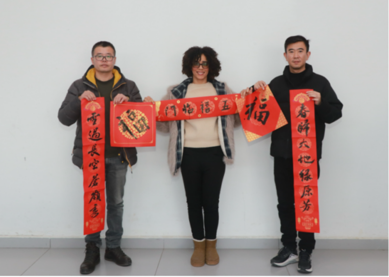 春联是楹联的一种。楹联习俗在2006年被列入中国第一批国家级非物质文化遗产代表性项目名录。在千百年的历史传衍过程中,楹联与中国古典诗、词、赋等文体互相影响、一脉相承,形式日益多样,文化积淀逐渐丰厚。老师详细地讲解了春联的平仄对仗规则、内容表达和应用。“真是太有魅力了!春联不仅在音律上要对应,内容上也要对应,每一副春联中都蕴含着丰富的文化内涵。”邓洁感叹到,“这种中国独有的文学形式,让我对中国人的精神风貌和价值追求有了更加深刻的认识。”