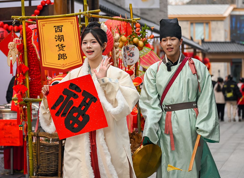 2025年1月11日,杭州上城区南星街道凤凰里文创园区,“西湖货郎”为商户和居民送福。