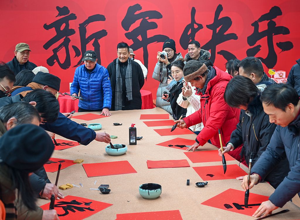 2025年1月11日,杭州上城区南星街道凤凰里文创园区,居民们在写福字。
