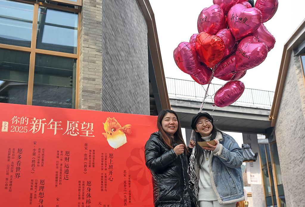 2025年1月11日,杭州上城区南星街道凤凰里文创园区,两位姑娘在新年愿望墙前打卡。