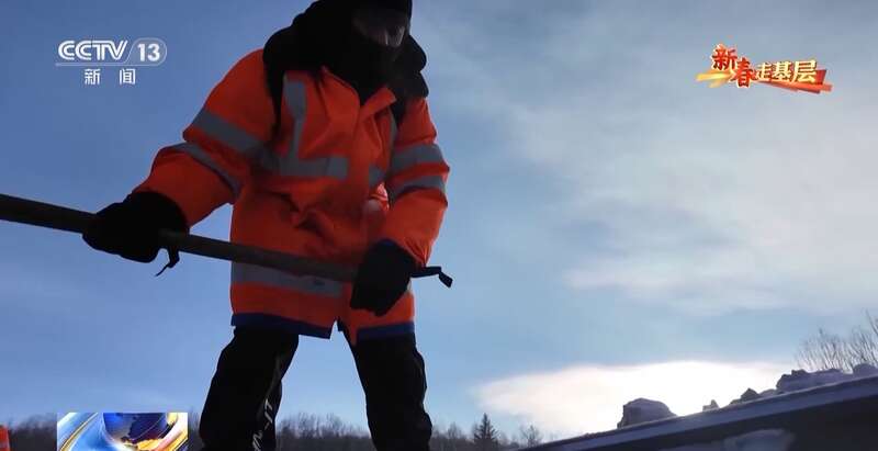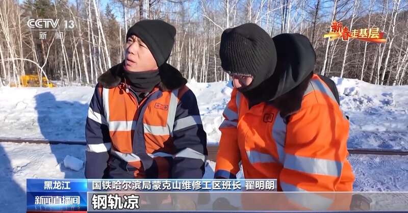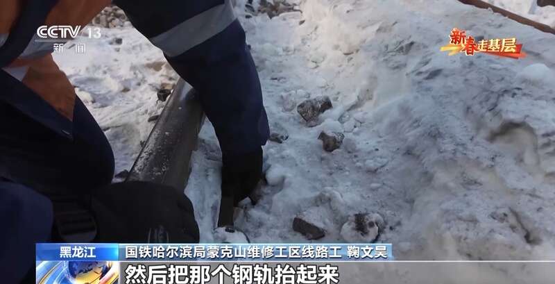 国铁哈尔滨局蒙克山维修工区班长 翟明朗:冬天因为气温比较低,钢轨凉,然后手热,它碰着铁直接就粘住了。不能直接往下拽,容易给皮拽下来。