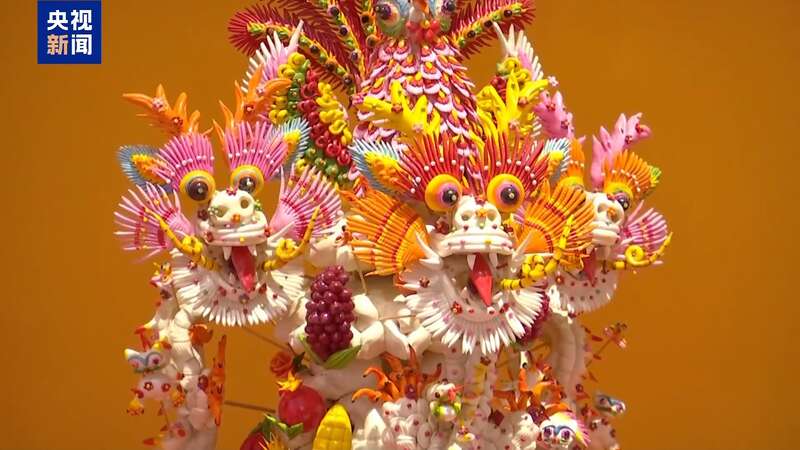 由地方非遗传承人制作,传统与创新兼具的面花作品《龙凤枣山》,用搓、揉、编等10多道工序结合制作而成,吸引了不少观众驻足观看。