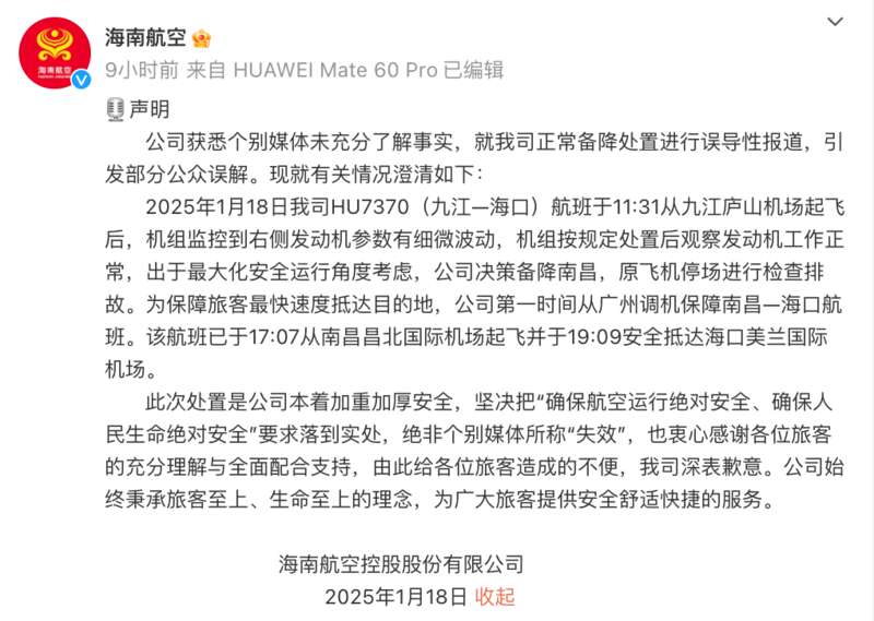 1月18日,海南航空发表声明回应一架飞海口航班备降南昌机场。