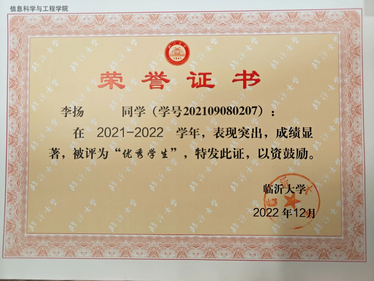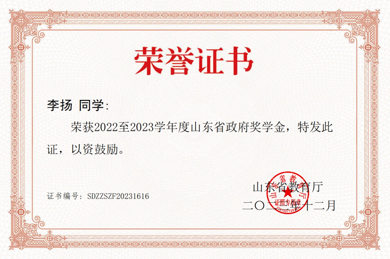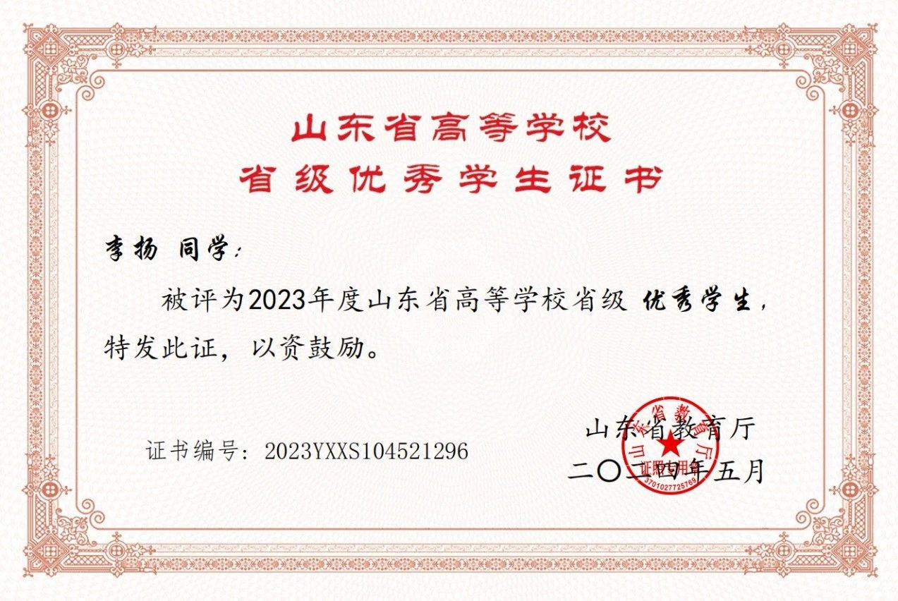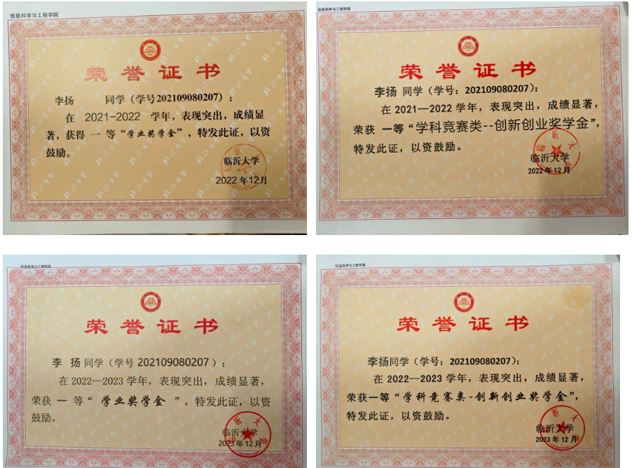 他学习成绩优异,综测成绩连续三年排名专业第一,连续三学年获得临沂大学一等“学业奖学金”。同时他注重提升综合素质,积极参与学科竞赛,连续三学年获得一等“创新创业奖学金”。获得2022-2023学年山东省政府奖学金、2023-2024学年国家奖学金、“山东省优秀学生”荣誉称号,并已取得英语四六级证书、普通话二甲证书。