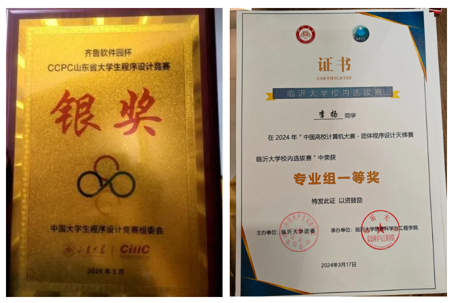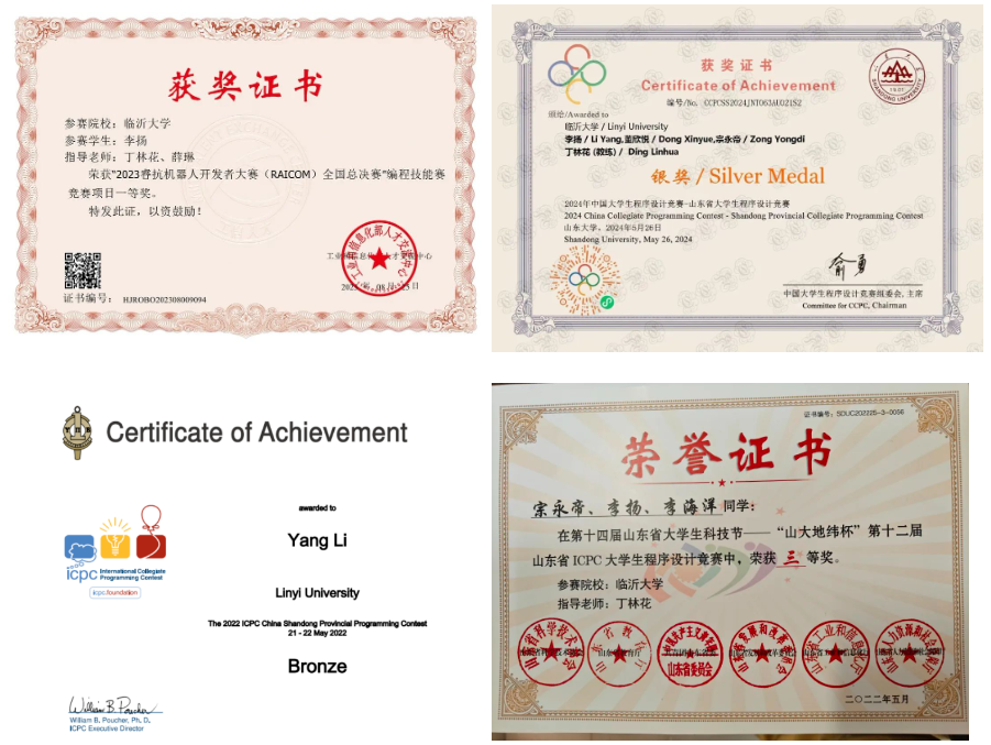 在创新创业方面,他积极参与创新创业比赛,以赛促学,不断提升自己的综合素养,他加入了临沂大学ACM实验室,认真学习算法,积极参加竞赛,获得2023年ICPC国际大学生程序设计竞赛亚洲区域赛济南赛站铜牌,第十三届山东省大学生程序设计竞赛银奖,“2023睿抗机器人开发者大赛全国总决赛”编程技能赛竞赛项目一等奖等几十余项奖项。