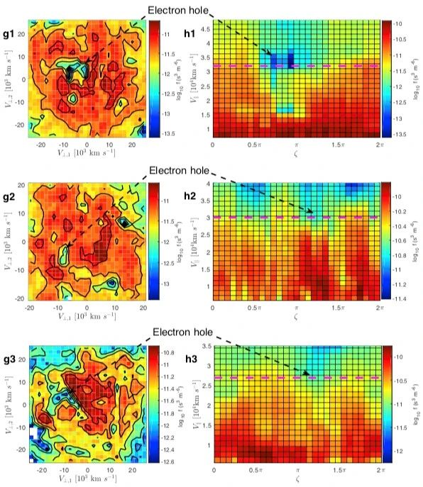 刘成明副教授等人通过理论计算,发现该合声波是局地不稳定性激发,波动从热电子处获取能量,而线性波动理论给出的波动增长频率范围明显低于实际观测到的波动频率,说明非线性波动-粒子相互作用是合声波的发生原因。进一步分析二阶非线性波动-粒子共振方程,得出控制非线性波粒相互作用的非均匀因子的确切值,其满足合声波的激发条件,波动相空间会出现非对称电子洞和共振电流。在对MMS卫星电子三维速度分布数据深入分析后,刘成明副教授等人在波动相空间首次发现了理论预测的非对称电子洞(图3)和共振电流(图4),从而为合声波形成的非线性机制提供了迄今最直接的观测和理论证据。