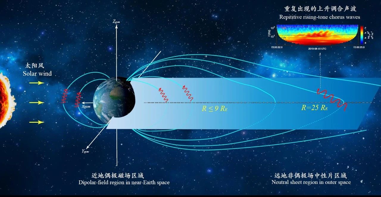 由于上述重要性,合声波从上世纪50年代以来,一直是空间物理学研究的前沿热点。通过近70年的卫星观测和理论研究,人们对合声波已经有了较为全面的认识,发现合声波主要发生在地球近地空间偶极磁场区域(图1),地球空间地磁场磁力线就像两端固定在地球南北磁极区的琴弦一样,当太阳风能量进人地球磁层空间,并通过相关物理过程拨动这些琴弦时,就会激发频率特征类似于清晨鸟儿的齐鸣合奏的电磁波,因此称为合声。合声的频率谱呈准相干的离散点,且频率具有啁啾(chirp)特性,由于相关空间等离子体物理过程的复杂性,直至今日,对合声波的产生和传播机制依旧充满争议,未有共识。