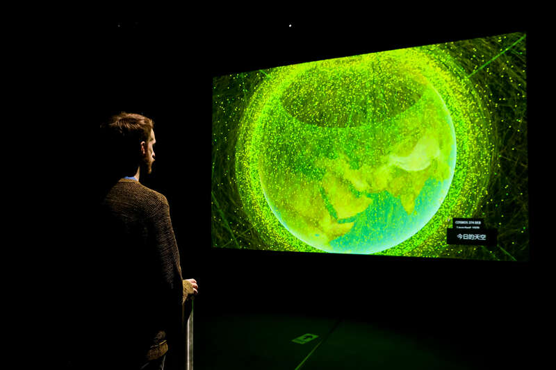 展厅内,“宇宙考古-探索时空的科学艺术之旅”展出了20件作品,分别来自瑞士、法国、德国、美国、加拿大、俄罗斯和中国7个国家的13位(组)艺术家,带领观众在几小时内回溯 138 亿年波澜壮阔的宇宙变迁历程。