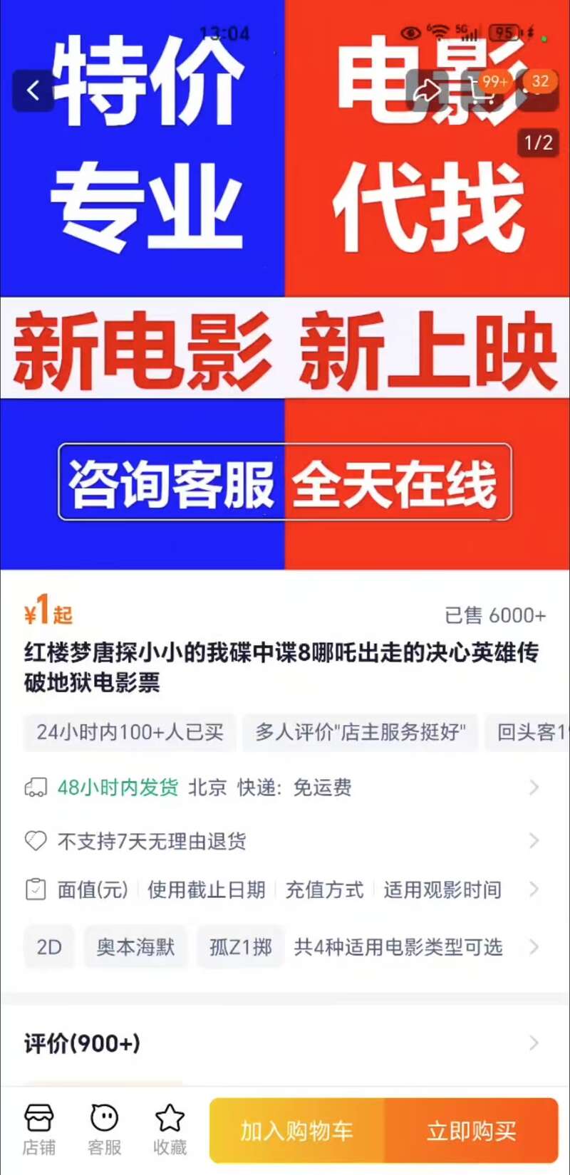 同日,澎湃新闻以“哪吒2抢先看”为关键词在淘宝上进行搜索,在展示的多家店铺中,选择销售1000+人“中国好素材666”的链接。该店铺标注“7年老店”,在“红楼梦唐探小小的我碟中谍8哪吒”的购物链接中,客服表示,选择货品“2D”、数量4个,即可拍下《哪吒2》的电影资源。目前,该物品已销售6000+人。下单支付4元后,客服发来一个网盘分享的文件:“哪吒之魔童闹海”。