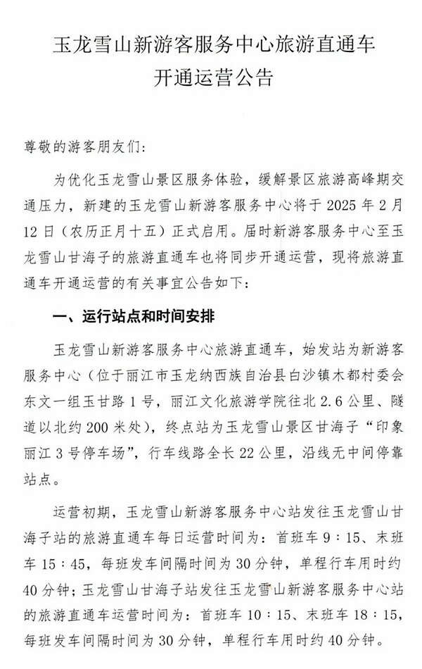 公告提示,初期运营第一周(2025年2月12日至2月18日),玉龙雪山新游客服务中心(游客中心站)至甘海子雪川游客港(玉龙雪山站):首班车9:00,末班车15:30,发车间隔30分钟,单程运行时间约35分钟。甘海子雪川游客港(玉龙雪山站)至玉龙雪山新游客服务中心(游客中心站):首班车10:10,末班车18:10,发车间隔30分钟。