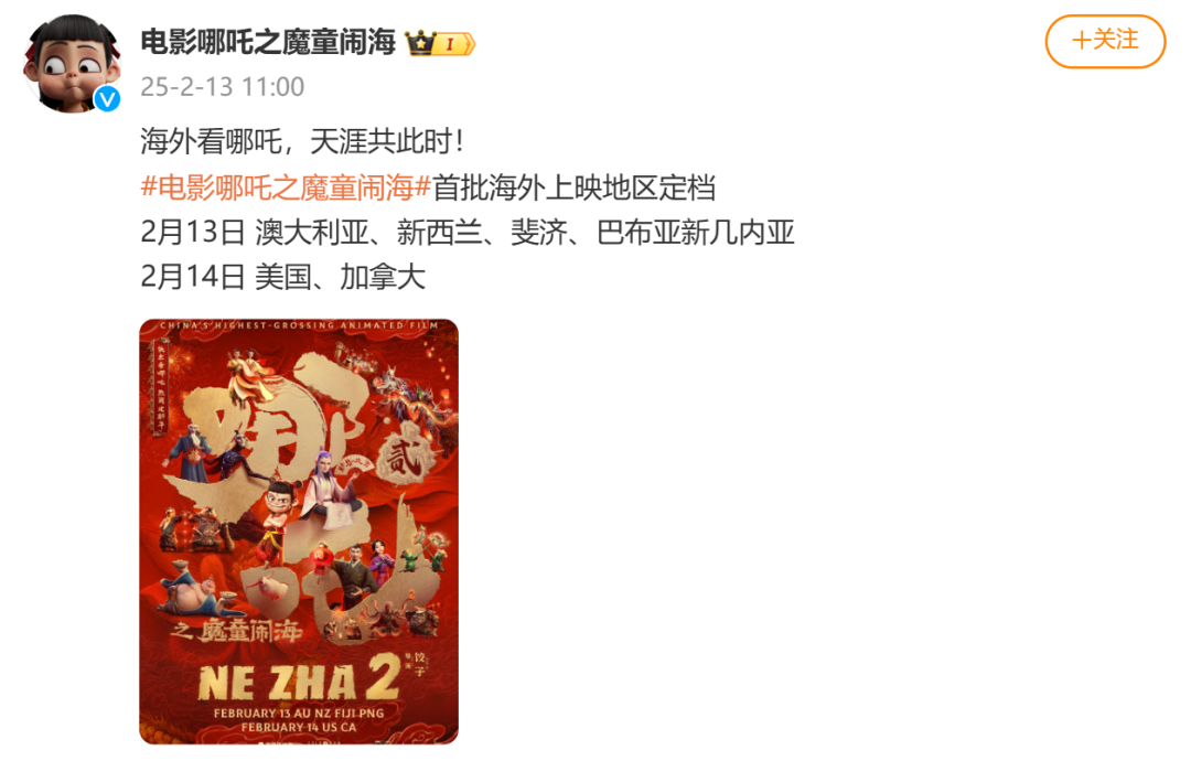 目前,《哪吒2》首批海外上映地区已定档,涉及澳大利亚、新西兰、斐济、巴布亚新几内亚、美国、加拿大......