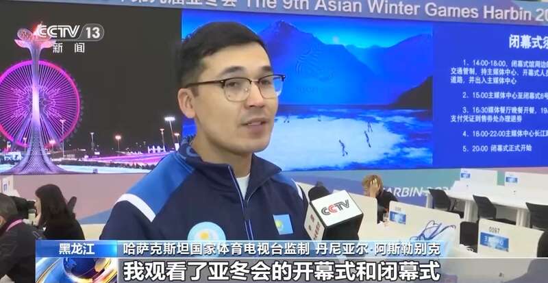 哈萨克斯坦国家体育电视台监制 丹尼亚尔·阿斯勒别克:我非常喜欢哈尔滨这座城市,我观看了亚冬会的开幕式和闭幕式。闭幕式将科技元素与现实情境巧妙结合,带来了美妙的体验。我衷心感谢在亚冬会期间辛勤服务的工作人员和志愿者们,让我感受到中国人民的热情与好客。