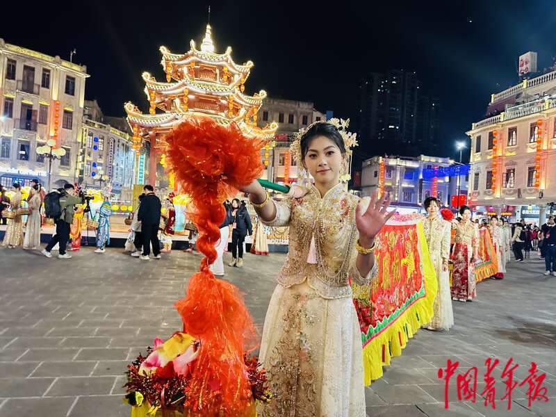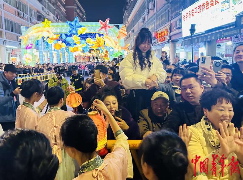 2月13日,广东汕头,巡游队伍与游客互动。活动现场的“百千万”灯谜台、英歌舞机器人表演、营灯民俗巡游、非遗文创墟市前人头攒动;营灯游巷、春讯盈祥、遗风赓扬、潮韵飘漾、恬野焕彩等沉浸互动环节,吸引了不少游客打卡拍照。中青报·中青网记者 林洁/摄