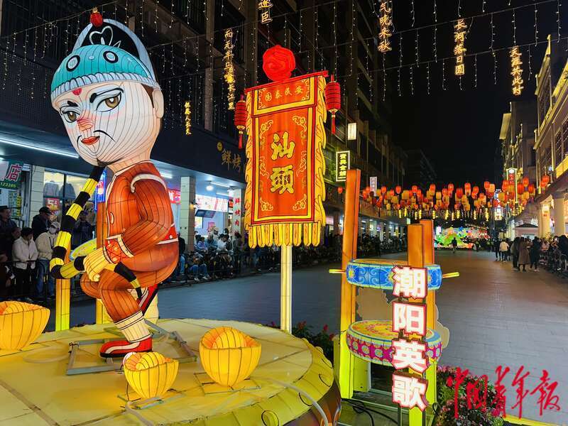 2月13日,广东汕头,潮汕文化特色的组灯随处可见。长达1.2公里的骑楼长街以汕头市安平路为轴,自小公园核心区绵延至西堤路,亮起英歌舞灯组“时迁”、潮汕古厝“巳巳如意”大门、英歌萌娃、潮剧“陈三五娘”、木雕“龙虾蟹篓”、花园牌坊、海洋观廊、学子挥春等造型花灯。中青报·中青网记者 林洁/摄