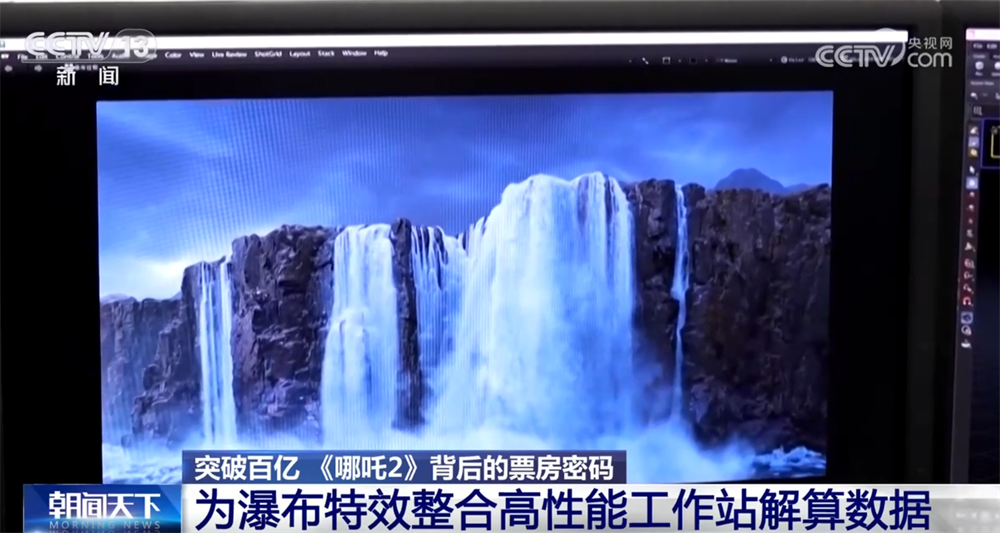 在影片中,哪吒闯的第二关是在深山密林的瀑布中和申正道决战,这场打斗特效十分精美。团队负责人介绍,为了呈现真实美感的瀑布形态,团队开发了瀑布制作流程自动化程序,将50台高性能工作站整合成解算集群,对数据进行批量处理。每帧镜头渲染32小时,光渲染时长就高达15天。