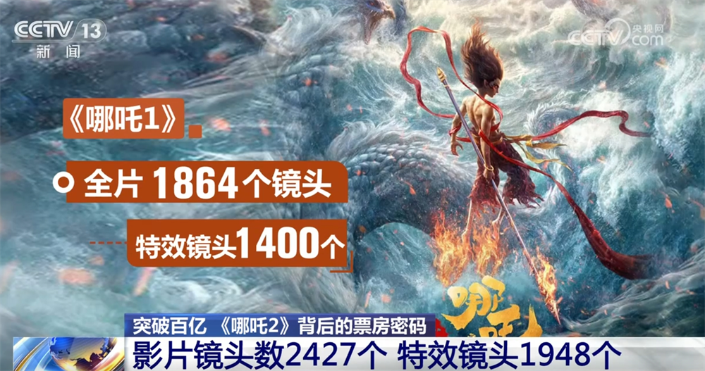 据电影主创团队提供的数据:《哪吒1》,也就是《哪吒之魔童降世》全片1864个镜头,特效镜头1400个;而《哪吒2》,镜头数达到2427个,其中特效镜头1948个。影片中的每一个特效镜头、每一帧画面都是138家动画公司、4000多名动画人的合力托举。
