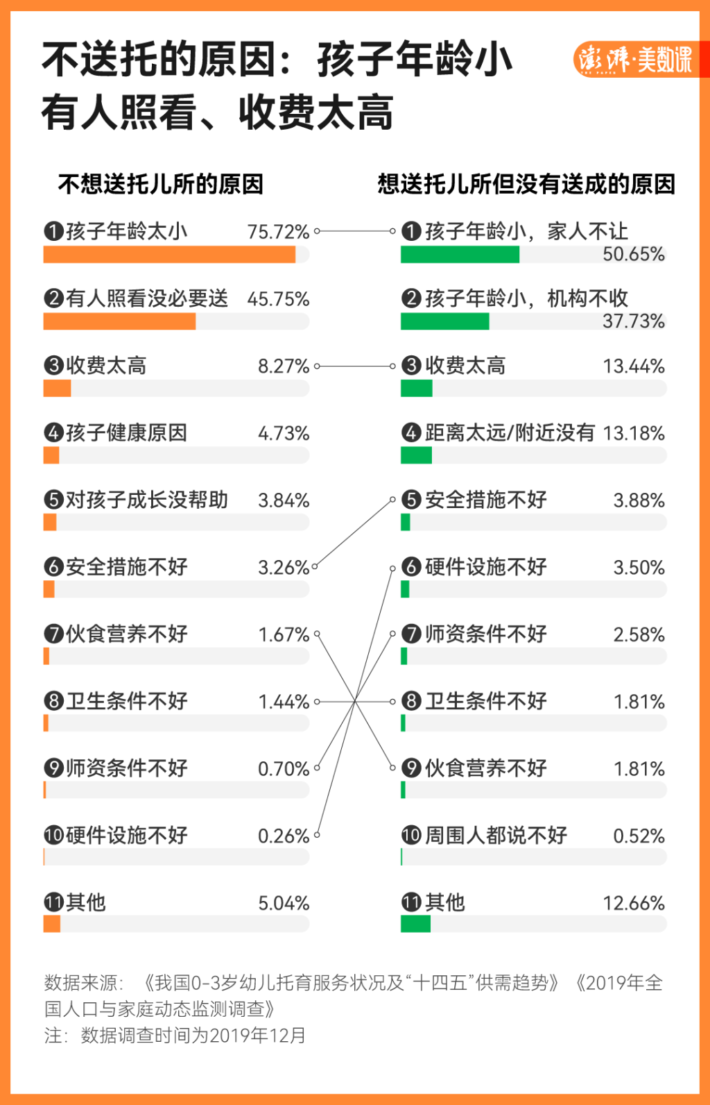 这些网友的想法并非个例。2019年监测调查显示,不送托的主要原因包括孩子年龄太小、有人照看、收费太高。