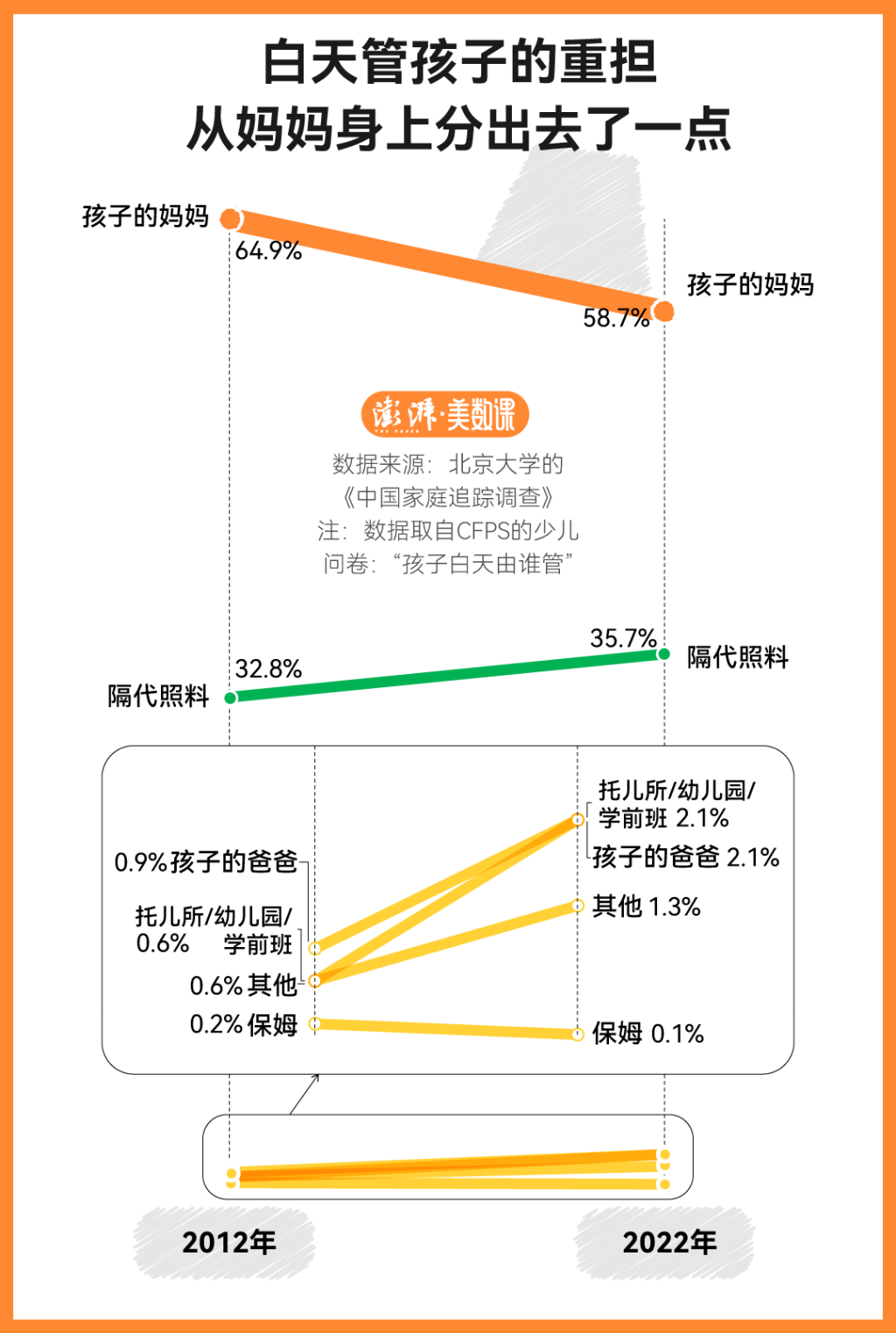 2022年CFPS的数据显示,10年间,家庭中女性的照料负担稍微减少了一点,部分爷爷奶奶和外公外婆开始带娃了。