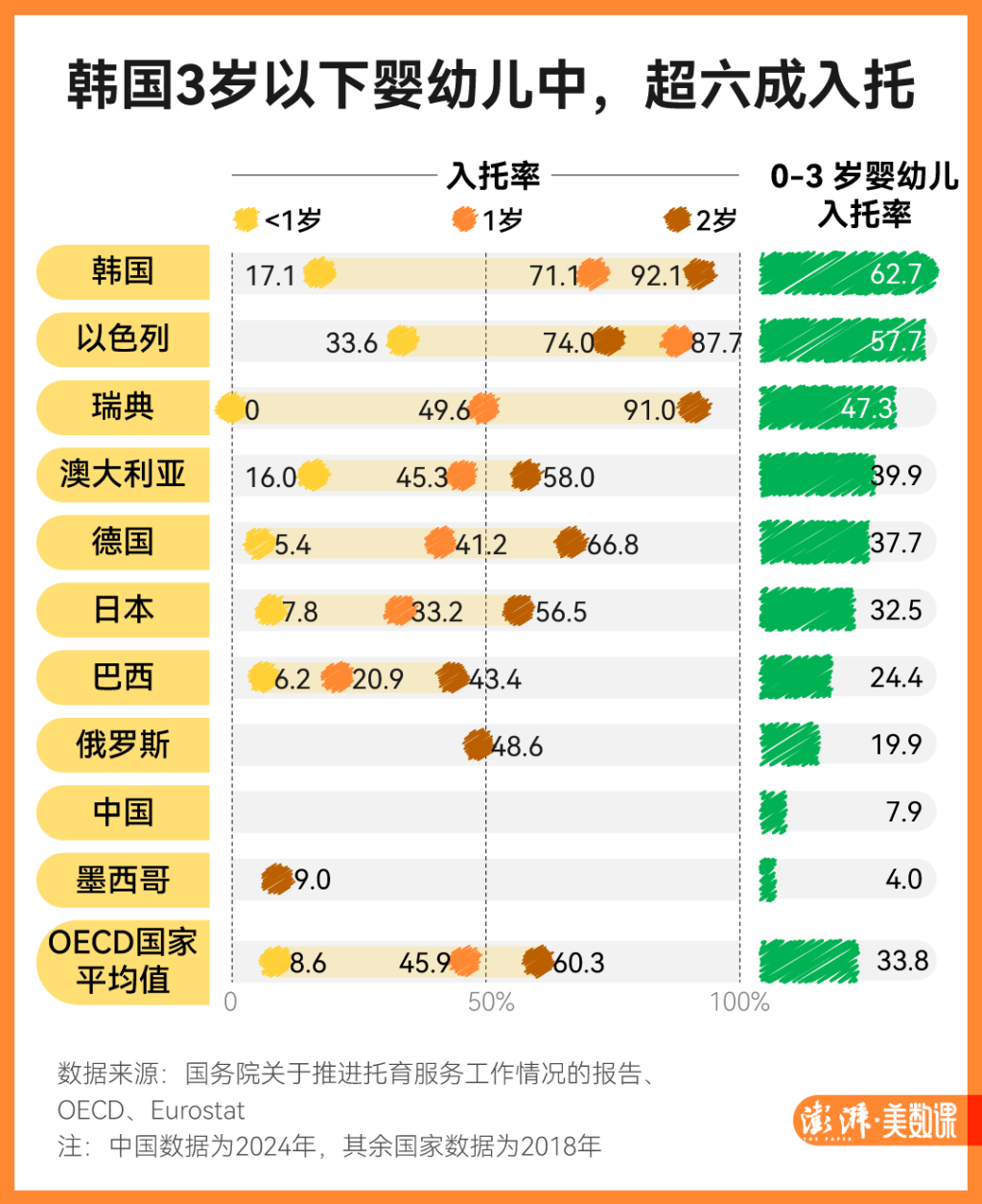 作为全球生育率倒数的国家,日韩为了让年轻人生孩子使出“浑身解数”,提供了优厚的托育政策。这两个国家的入托率在连年攀升。
