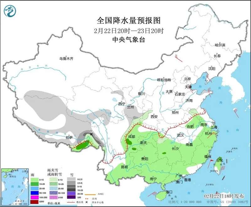 22日20时至23日20时,西藏东部和南部、青海南部、甘肃南部等地部分地区有小到中雪或雨夹雪,其中,西藏东部等地局地有大雪。江淮西部、江南大部、西南地区东部和南部、华南、台湾岛等地部分地区有小到中雨。