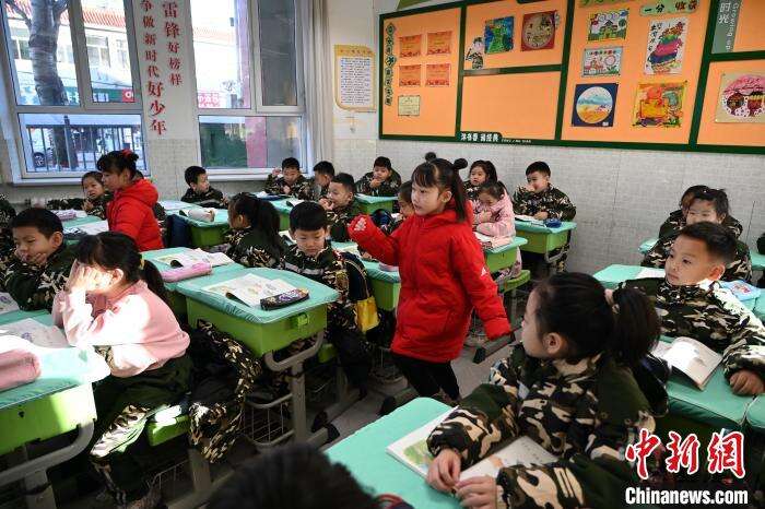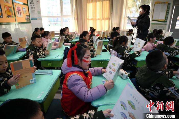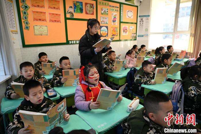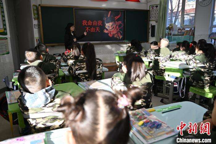 2月24日,呼和浩特市玉泉区五塔寺东街小学内,一年级学生扮演“哪吒”上课。中新社记者 刘文华 摄