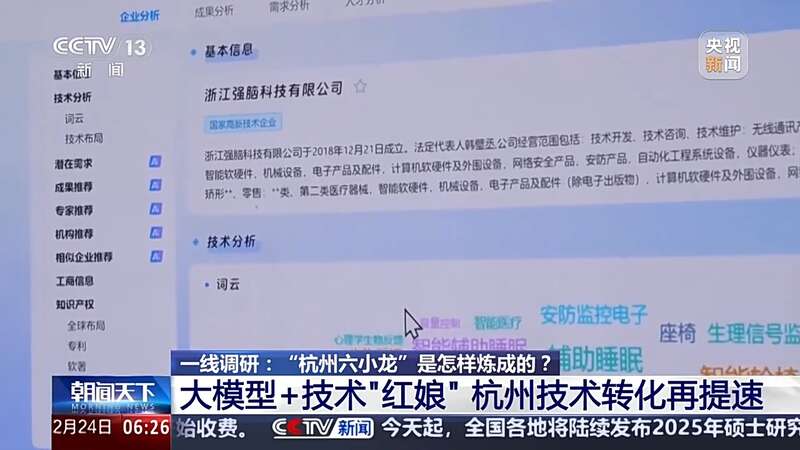 当记者来到杭州技术转移转化中心,全国首个成果转化领域的人工智能大模型刚刚完成升级迭代,记者看到,只要输入某一家企业的名称,大模型就能自动分析企业的业务方向、潜在的技术需求,并自动匹配上来自科研院所的最新技术成果。