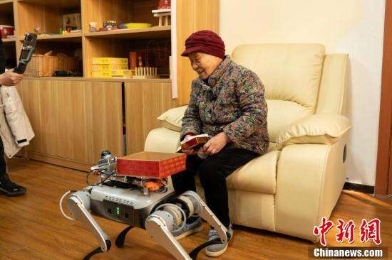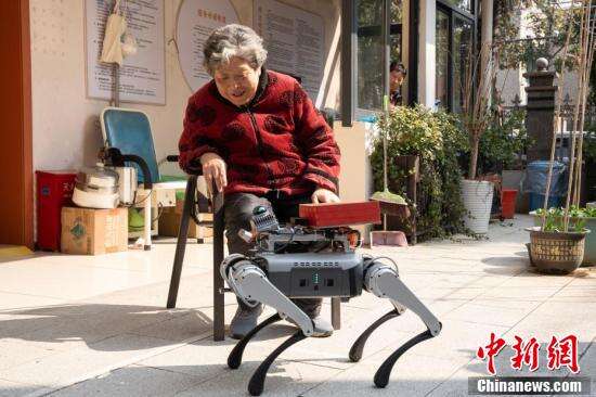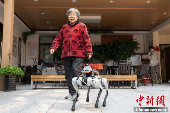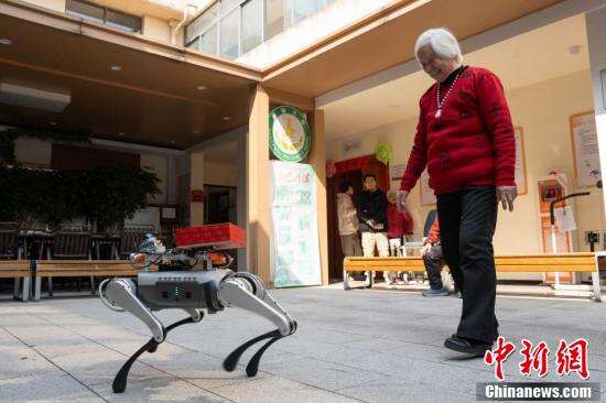 2月24日,机器狗“小西”陪伴老人散步。为进一步推进智慧化养老,近日,杭州市西湖区古荡街道的金秋养老家园率先引入机器狗,该机器狗体重仅14公斤,搭载高精度激光雷达和摄像头,能自主规划路线、避开障碍物,还能通过语音与老人互动,实现递送物品、陪伴散步等多种功能。