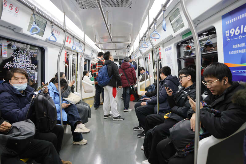 车厢内坐满了乘客,许多地铁爱好者慕名前来。中青在线见习记者 陈思阳/摄