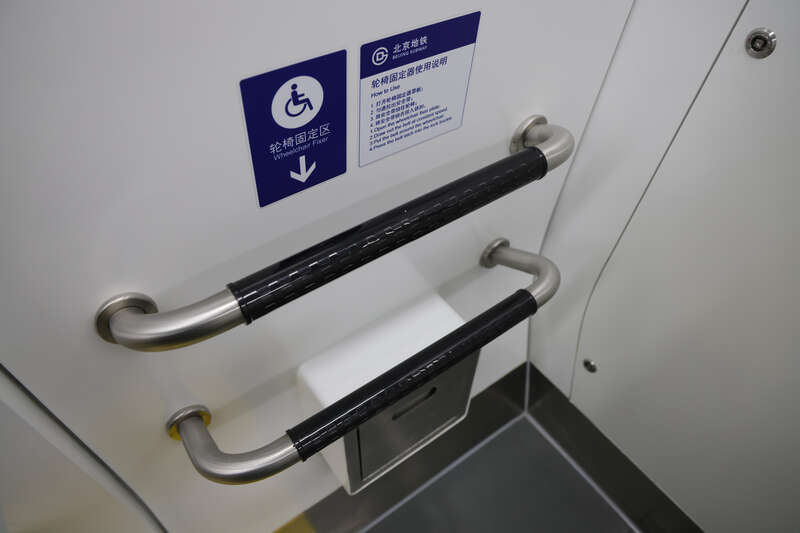 轮椅区设高低平行扶手,固定器有自动回弹功能。中青在线见习记者 陈思阳/摄