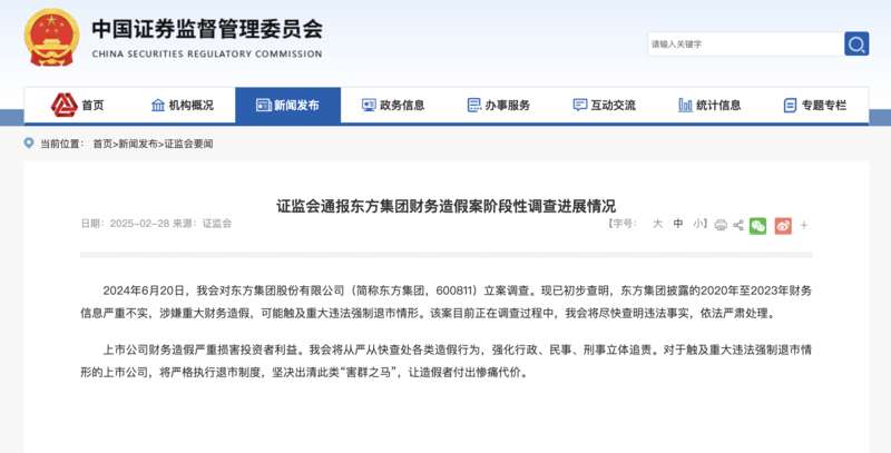 2月28日,证监会发布通报:2024年6月20日,我会对东方集团股份有限公司(简称东方集团,600811)立案调查。现已初步查明,东方集团披露的2020年至2023年财务信息严重不实,涉嫌重大财务造假,可能触及重大违法强制退市情形。该案目前正在调查过程中,我会将尽快查明违法事实,依法严肃处理。