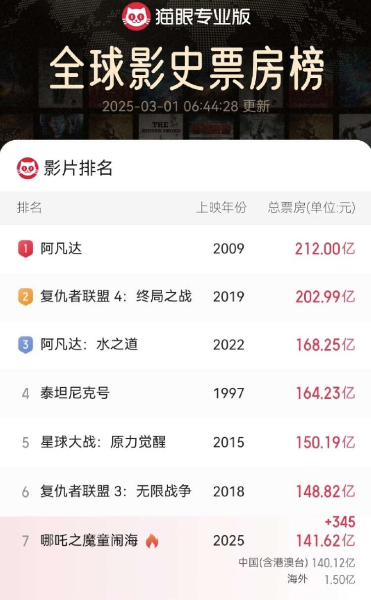 《哪吒2》“龙抬头”这天再创纪录,进入全球票房榜前7名