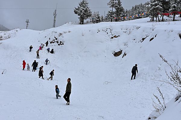 2025年3月2日,云南省迪庆藏族自治州香格里拉市迎降雪天气,游客乐享雪趣。 中新社记者 李嘉娴 摄