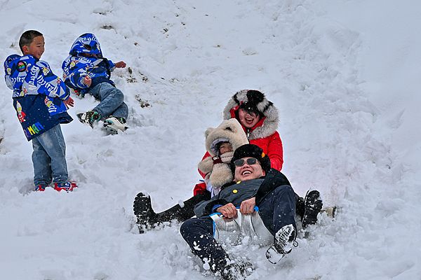 2025年3月2日,云南省迪庆藏族自治州香格里拉市迎降雪天气,市民自制雪板乐享雪趣。 中新社记者 李嘉娴 摄