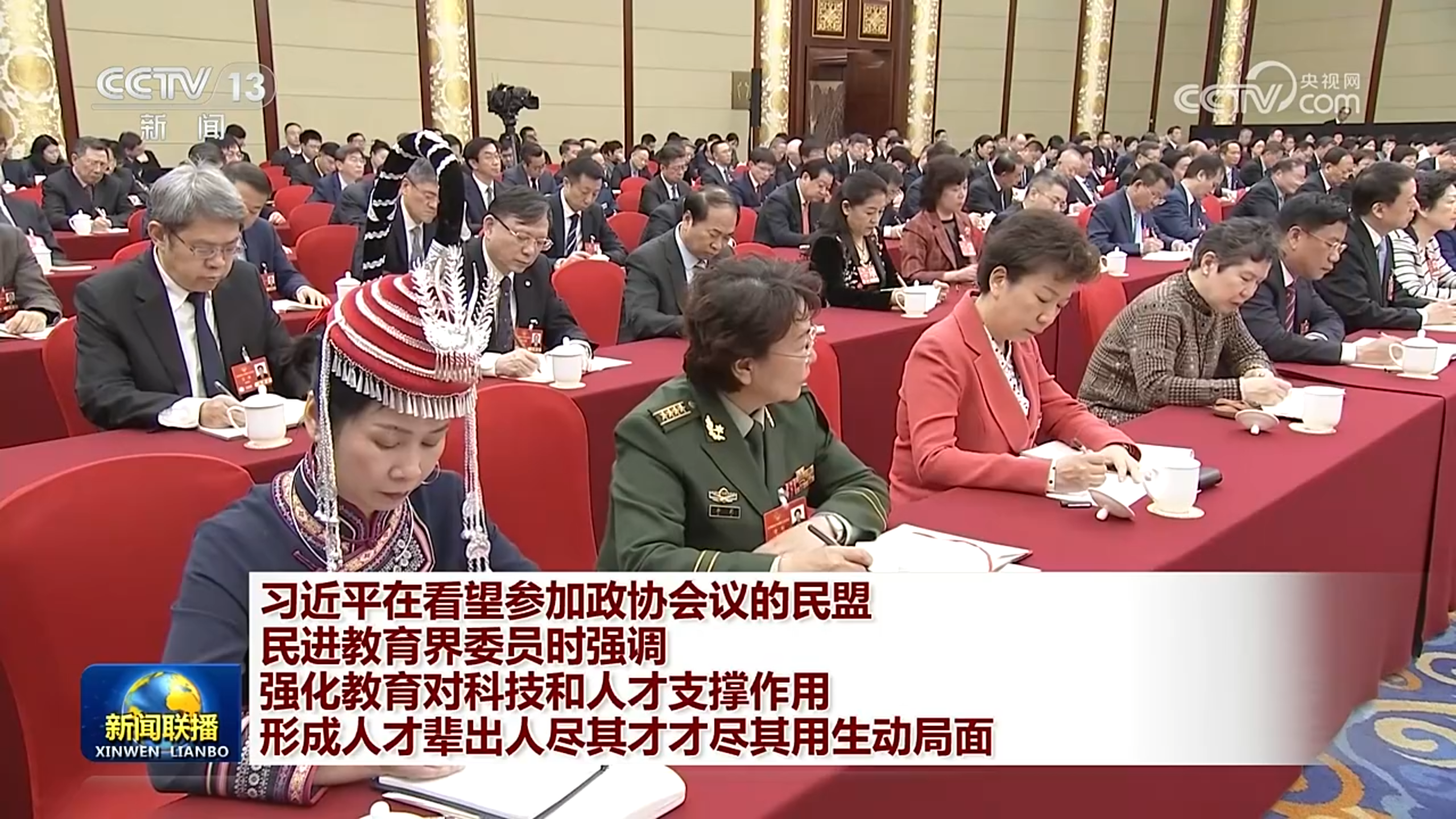 3月6日下午,中共中央总书记、国家主席、中央军委主席习近平看望了参加全国政协十四届三次会议的民盟、民进、教育界委员,并参加联组会,听取意见和建议。他强调,新时代新征程,必须深刻把握中国式现代化对教育、科技、人才的需求,强化教育对科技和人才的支撑作用,进一步形成人才辈出、人尽其才、才尽其用的生动局面。