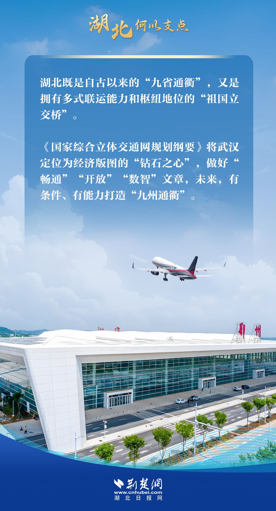 湖北既是自古以来的“九省通衢”,又是拥有多式联运能力和枢纽地位的“祖国立交桥”,《国家综合立体交通网规划纲要》将武汉定位为经济版图的“钻石之心”。根据《纲要》,我国将建设20个左右国际性综合交通枢纽城市,武汉入列;建设一批具有较强国际运输服务功能的铁路枢纽场站,武汉上榜。武汉—鄂州同城化推动双机场联动,是全国第4个、中部唯一的双机场大都市。花湖机场货邮吞吐量大幅攀升,是全国首个获批国际机场的专业货运枢纽机场,可望努力跻身国际快递第一梯队。近日发布的《国家物流枢纽布局优化调整方案》中,武汉入选国家陆港、港口、空港、生产服务、商贸物流枢纽城市,“五型”齐全同样是中部唯一。