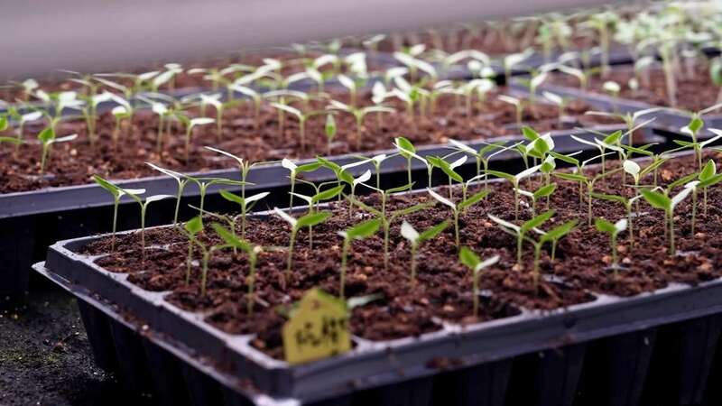 育苗工厂内,工人们用自动化播种机,依次完成装盘、上料、播种、覆土、浇水等工序。