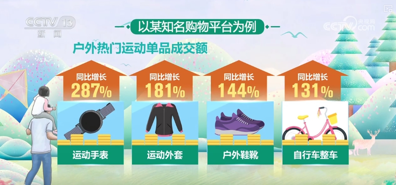 不只线下门店销售火爆,在网络销售端,2025年春季,户外运动相关装备的成交额也有大幅增长。以某知名购物平台为例,一些户外热门运动单品,如运动手表成交额同比增长287%、运动外套同比增长181%、户外鞋靴同比增长144%、自行车整车同比增长131%。